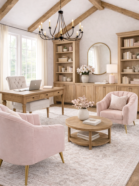 A larger office allows for more layering, which is where this design really shines. With additional room, you can introduce soft seating, a larger rug, and more decorative elements without the space feeling cluttered. Natural wood keeps everything grounded and warm, while blush accents soften the overall look and add a sense of cohesion.